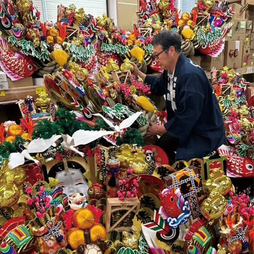 Rake is considered lucky charm as it is “raking luck”. The okame (female mask), crane, pine, oval gold coin, and red sea bream that decorate the rake are also considered lucky charms. The materials are colored and woven one by one manually by artisans.