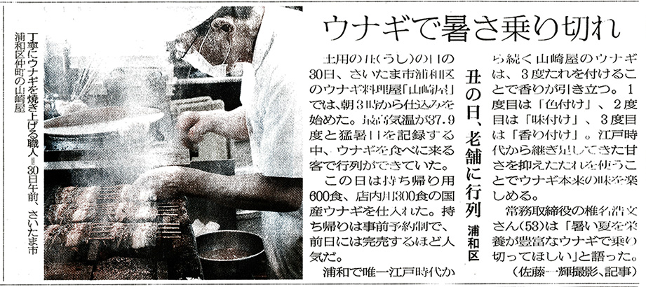 7月31日 月曜日、埼玉新聞1面に、浦和のうなぎ「山崎屋」さんの記事が掲載されました。